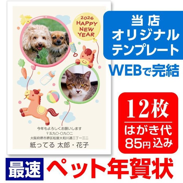 発送予定日:2025/10/30 年賀状じまいシールは18枚です。 お年玉付き年賀はがきに印刷! 格安 相手先さまの住所をプリンターで印刷したり、書いたりするだけで、手早くすぐに投函できる年賀状です。 ▼▼印刷する年賀状について▼▼ ご注文を受け付け次第、当店よりデザイン編集用のURLを記載したメールをお送りします。(夕方以降は翌日になる場合が有ります) ご希望のデザイン、編集方法をお選びいただき、必要な情報を入力いただきましたら印刷画面を確認のうえ、編集完了ボタンを押してください。 編集いただいたデザインで年賀状を印刷し、発送いたします。 ※インクジェット用ではありませんので、書き込む際は、油性ペンで。 ペット年賀状 写真年賀状 12枚 自由編集 年賀はがき お年玉付 年賀状じまいシール付 ■選べる枚数■ 差出人自由 うま 馬 午年 イラスト 10枚+2枚