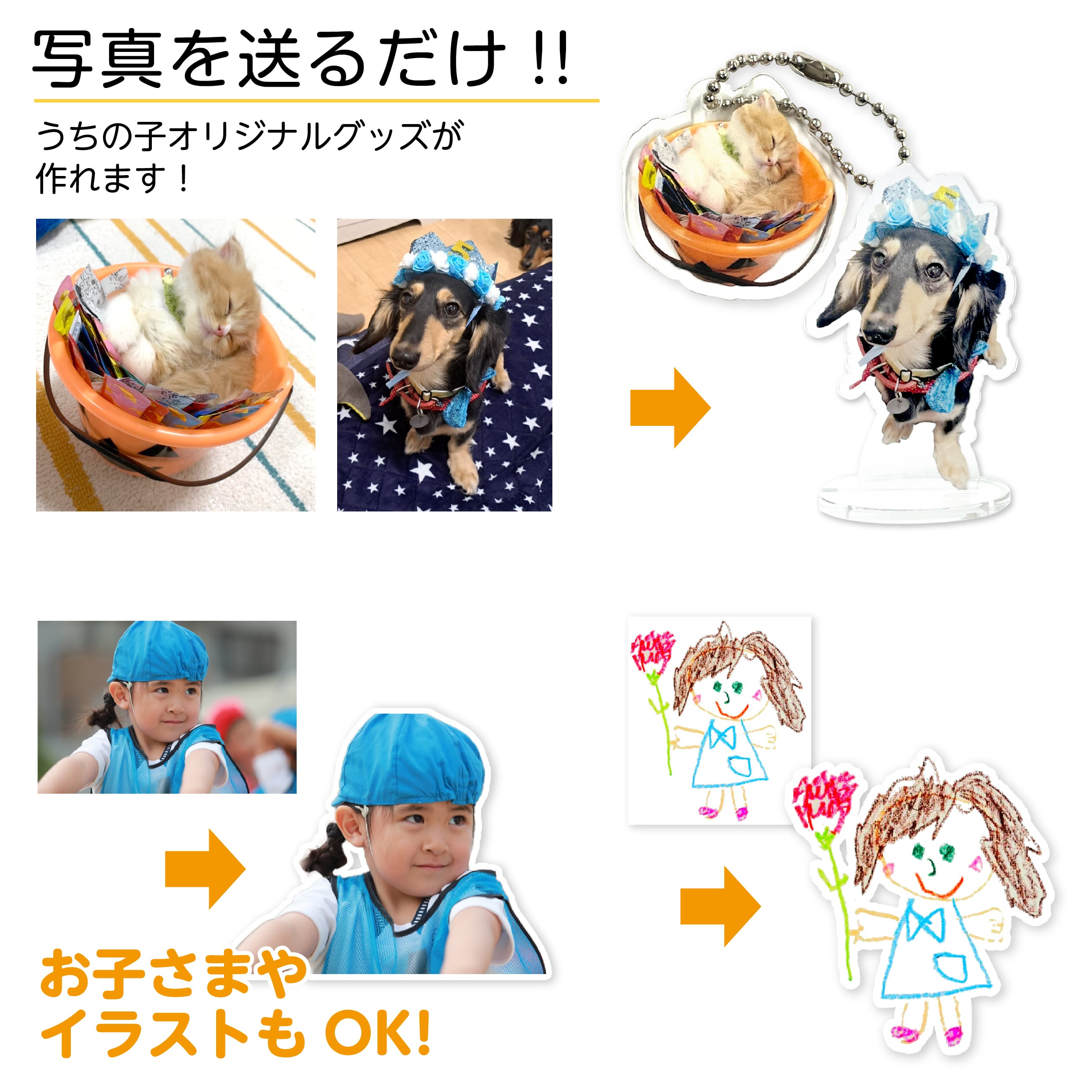 スマホの写真を送るだけで、あなただけのオリジナルアクリルキーホルダーやアクリルスタンドが作れます!